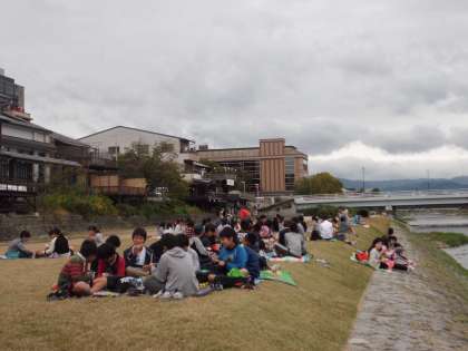 時代祭の見学に行ってきました。会場に向かう途中に,鴨川の河川敷でお弁当を食べました。おうちの人に持たせてもらったお弁当をおいしくいただきました。ご準備ありがとうございました。