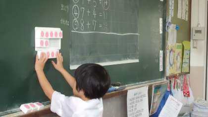 算数は「たしざん(2)」の学習に入りました。今までの足し算と違って,繰り上がりをします。最初は,「10をつくる」という考え方が定着するように,数図ブロックを動かしながら計算しています。