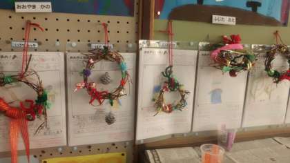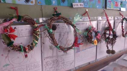 作ったリースを教室の壁に飾りました。飾ってみると,教室の中がクリスマスの雰囲気になりました。見ているだけで,うきうきしますね。