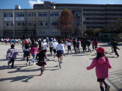 子どもたちは1200m走った後にも関わらず,音楽に合わせて元気に走っていました。