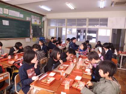 給食当番の人が給食室まで取りにいって,教室で中学生の人と一緒に食べました。