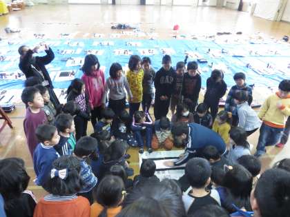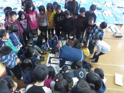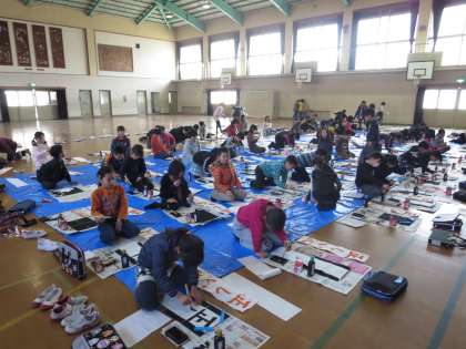 まずは,校長先生のお手本です。全員で集まって熱い視線を注ぎました。素晴らしいデモンストレーションに,子どもたちの間からは「すごい!」「めっちゃきれい!」と感嘆の声があがりました。その後,校長先生の「ドーン!」という太鼓の音を合図に,それぞれが書き始めました。体育館は寒かったのですが,それも忘れてみんな真剣に集中して書いていました。