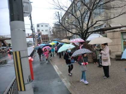 雨の中の登校でしたが,その雨を吹き飛ばすように,元気のよい声で「おはようございます。」の挨拶をしていました。女性会の方々とともに笑顔で挨拶を交わしていました。