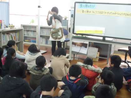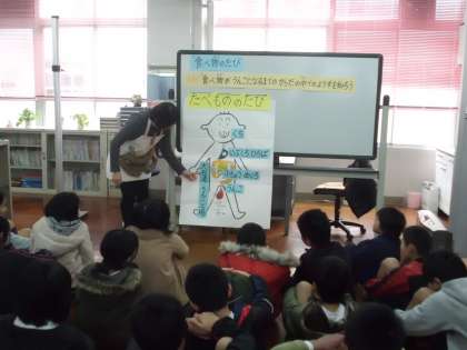計測前にある保健指導は,「食べ物のたび」というテーマで,食べ物がうんこになるまでのからだの中の様子を,佐々木先生に教えていただきました。