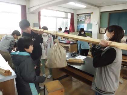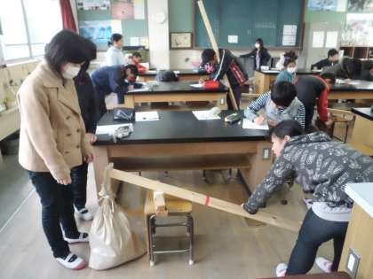 今日は,実用てこを使って,棒をどのように使ったら小さな力で持ち上げられるのかをグループで考え,いろいろと試してみました。