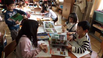 国語「おみせやさんごっこをしよう」では,「ものの名まえ」の学習を生かして,お店の品物を考えています。グループの子と相談したり,図鑑を見たりして,ノートにたくさん品物を書いています。