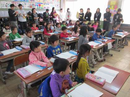 今日は,伏見中支部の学校に向けて研究発表会を行っています。1年生「おおいほう すくないほう」・4年生「変わり方」・5年生「順々に調べて」の授業を公開しています。