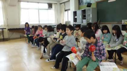 音楽では,「すずめがちゅん」の曲に合わせて,色々な楽器を鳴らしてみました。音楽室が大好きな子どもたち。「これは,どんな音が出るんだろう。」と,友達と楽器を交換しながら楽しく鳴らしていました。