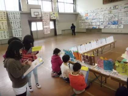 「ぼくらが昨年やったやつや!」「このコリントゲームおもしろいなぁ」と,普段なかなか見ることができない他の学年のお友達の作品に釘付けでした。