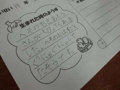 生まれた時の様子や,名前の由来,お家の人の気持ちなどを書いていきます。