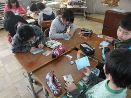 プレゼントは,お祝いの言葉や絵をかいたしおりです。