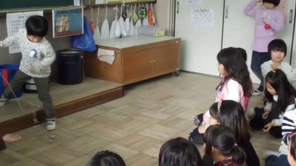 生活科で楽しんできた昔あそびの発表会をしました。こま,けん玉,あやとり,お手玉…自分が得意な技をみんなの前で披露しました。こまを何度も空中に上げる技や,けん玉で「もしかめ」をする子など,芸達者な子が多かったです。見ている子たちからも何度も歓声が上がっていました。