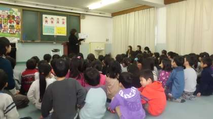 木曜日にお話の会がありました。今回は,「あかくんとあおくん」の人形劇と「いっぴきおおかみのそろり」の読み聞かせでした。人形劇は漫才のようなやりとりが面白く,終始笑いが起こっていました。「そろり」は気の小さいおおかみで,展開がどうなるのかみんな真剣に聞いていました。