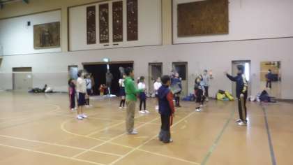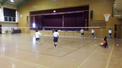 体育館で「バドミントン体験教室」をしました。土曜日にも関わらず,たくさんの子どもたちが参加しました。初心者と経験者に分かれ,初心者はシャトルを打つ練習などをし,経験者は大人と混じって試合や打合いをしました。汗をかいて,楽しそうに打ち合いをしていました。