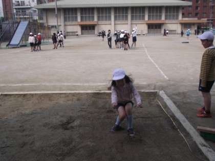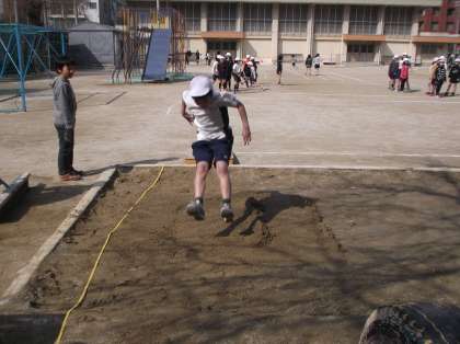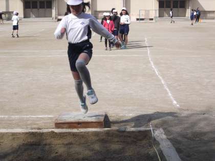 「片足で踏み切り,両足で着地する。」とい跳び方が初めてなので,初め両足で踏み切ってしまったり,足が合わなかったりしていましたが,練習するうちにだんだん上手になってきました。