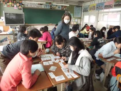 まずはじめに,桃太郎のお話通りにイラストを並べ替える活動をグループでしました。