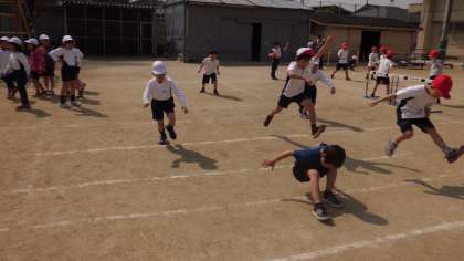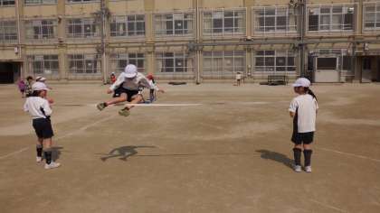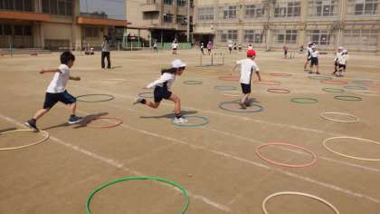 体育では,「とびくらべ」をしています。ラインを越えるように遠くに跳んだり,ゴムの高さを変えて高く跳んだり,フラフープの島から落ちないように道順を考えながら跳んだりしています。友達と競ったり協力したりして,楽しく活動しています。