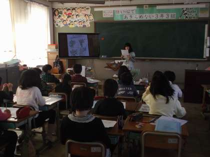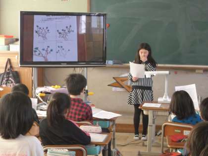 木のスケッチをテレビに映し,変化の様子や1年間観察しての感想などを,発表しました。
