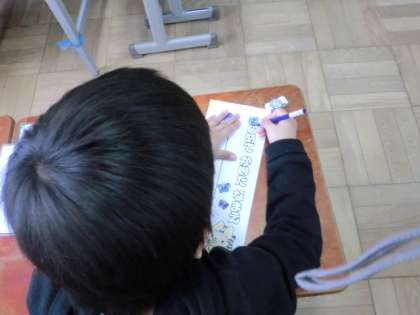 机にはってあるシールを見ながら,丁寧に書いていました。