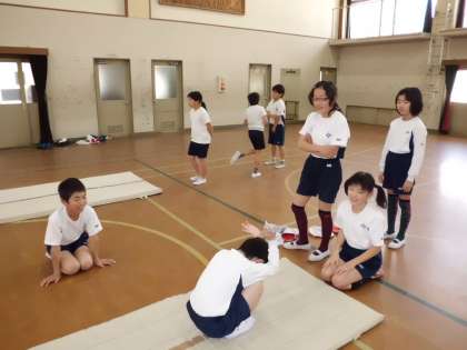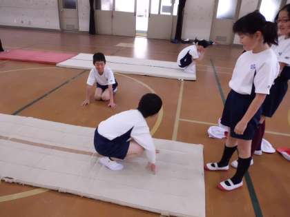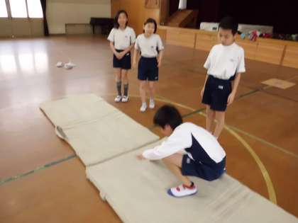 前転から始めました。とってもきれいに前転をする子どもたちです。