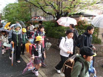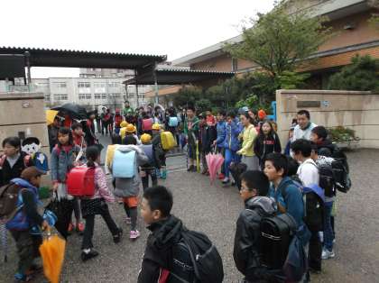 朝から,町別リーダーの人が,列の先頭で,下級生を連れて学校に来てくれています。