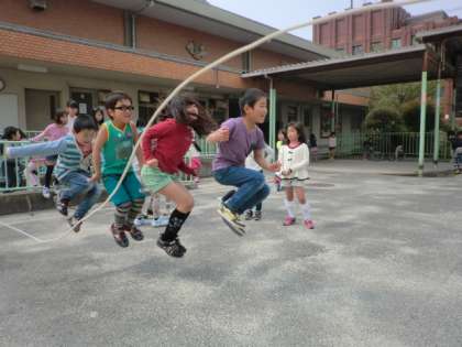 係活動が発足しました。「みんなあそびがかり」が早速,「大縄をしようよ!」と提案してくれました。みんなで8の字などをして楽しみました。1年生の時より度胸がついて,どんどん続けて縄の中に入って来れるようになってきました。