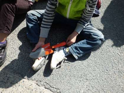 校門の前にクラスごとで並び,班でスコップを2つずつ持ち,さぁ出発〜☆