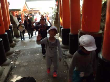 帰りも,千本鳥居をくぐって帰りました。たくさんの観光客の方がたけのこを背負う子どもたちの行列に驚いておられました。
