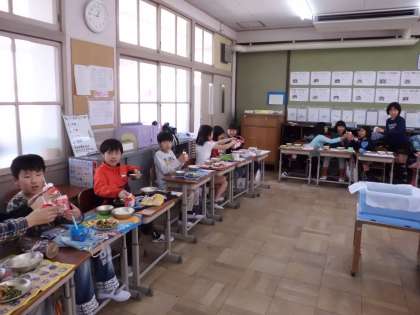 牛乳で乾杯をした後,みんなで丸く輪になって楽しく給食を食べました。