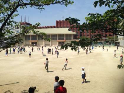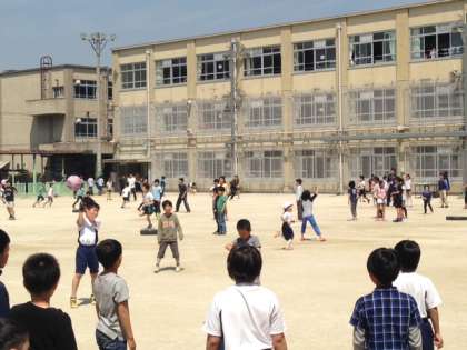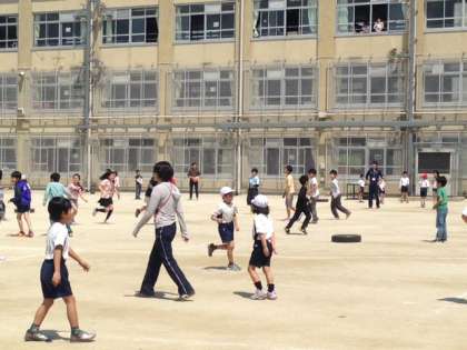 中間休みの運動場。朝休みのときよりも,大勢の子どもたちと教職員が遊んでいます。