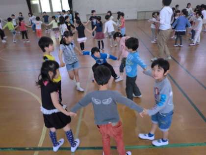 つぎのあそびは「なべなべそこぬけ」でした。はじめは2〜3人ペアでやり,どんどん人数を増やしていきました。最後は8〜10人の大きな輪でしました。「手を離しちゃだめだよ!」と優しく1年生に声をかけていました。