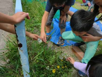 国語では,「たんぽぽのちえ」の学習をしています。教科書を読み,色んなたんぽぽの姿があることを知り,「たんぽぽを生で見てみたい!」という意見が出たので,学校の畑に探しに行きました。何十本も生えており,「あ!ぐったりたんぽぽ!」「これは,ふわふわたんぽぽだ!」とかわいいネーミングをして呼んでいました。