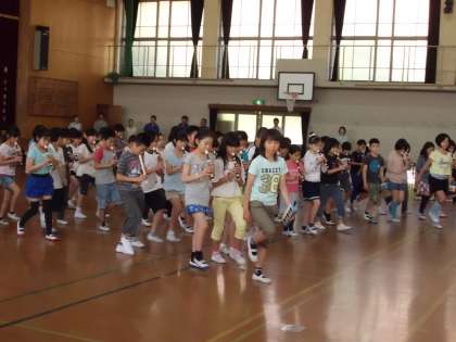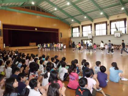 4年生の出し物は,まず,リコーダーで「レッツゴーソーレ」を演奏しながら入場し,お祝いの言葉と,ミッキーマウスマーチの合奏を発表しました。