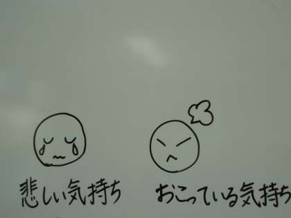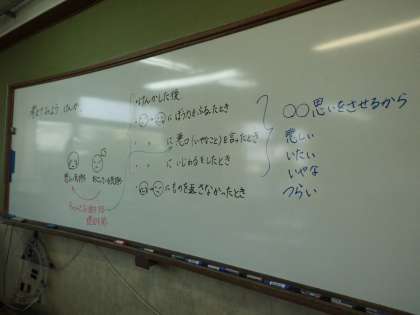 今日の道徳では「考えてみよう けんか」と題して、人に対しての接し方についてお話をしました。まず,上の写真にある顔のイラスト2枚から自分たちで状況を考察し,どうしなければならなかったのかと,その理由について話し合いました。