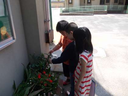 青空の下、みんなで春のお花を探しに学校内を歩きました。