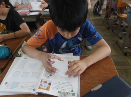 「あ!鏡の向きを変えると見え方が違う」「線対称な図形になった!」など,前時までの学びを生かして考えることができていました。