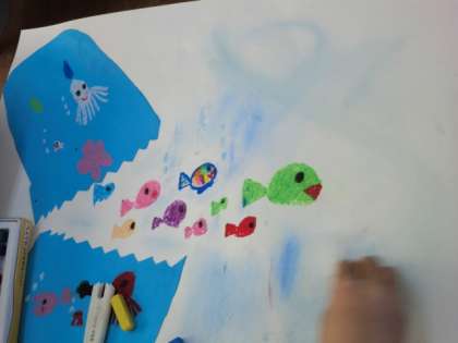 図工「ふしぎなたまご」では,たまごから出てきたものを想像して描いています。自分の好きなもの,海の世界,すてきな音楽…色々なイメージが広がっています。
