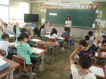 算数では,T.Tとして入っていただいている葛川先生と一緒にわり算の学習をしています。今日は,わり算を含む3要素2段階の問題に取り組みました。