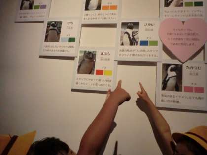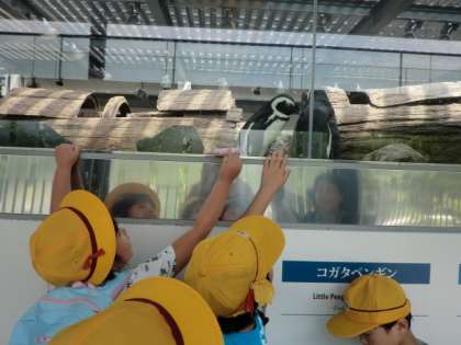 「1番好きな生き物は何だった?」と聞くと,「ペンギン!」と答えた子どもがたくさんいました。穴を覗き込んで「あれ?たまごをあたためているのかな?」と観察したり,自己紹介コーナーで「さかい」というペンギンを見つけ,「わぁ!酒井先生と同じや!」と喜んだりしていました。