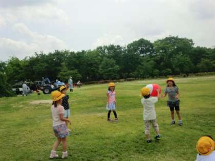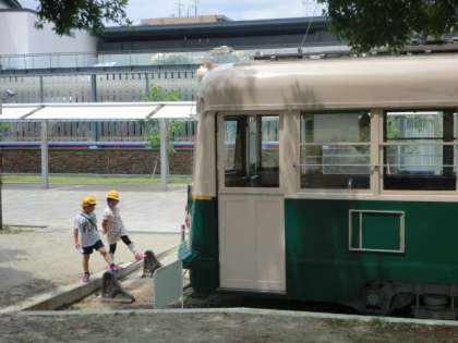 お弁当を食べた人から,梅小路公園で遊びました。電車を見たり,ボールあそびをしたりしていました。