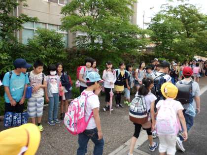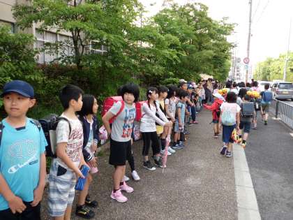 今日は砂川小学校で取り組んでいるあいさつ運動<スマイル運動>の日です。今日の担当は5年生。校門前に立って元気よく挨拶をします!