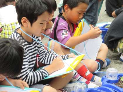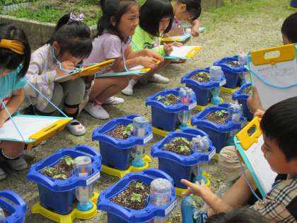 芽の大きさや、葉の形、葉の模様、茎の色、葉の手触りなど、少しの時間であさがおの成長を知ることができたようです。