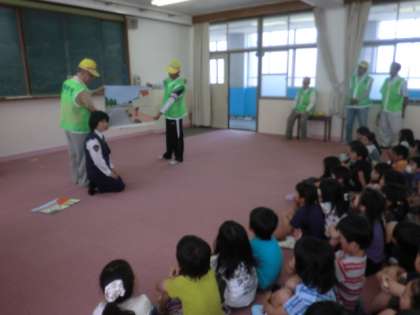 今日は,伏見警察署の方と安全ボランティアの方々に,道を歩く時に気をつけることを教えていただきました。