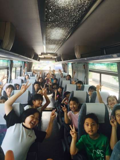 バスの中では歌の練習をしています。主にキャンプファイヤーの歌を歌っています。