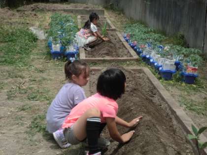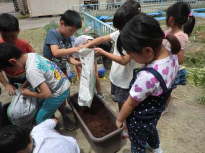 さあ,いよいよ苗を植えます。なすととうもろこしを植える畑は畝を作り,プランターには新しく栄養たっぷりの土を入れました。