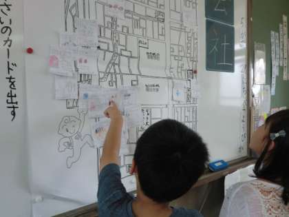 校区でお気に入りの場所を書き,校区地図に貼っていきました。「マツモトを書いている子が多いね。」「へぇ,こんなところに大きな犬がいるんだ!」と,地図を見て色々な気付きをしていました。