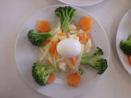 この班は,ブロッコリー,ニンジン,じゃがいも,たまごを入れトマトドレッシングをかけて食べました。赤に,緑に色鮮やかなカラフルコンビネーションサラダができました。ブロッコリーはもう少し茹でたほうが良かったですね。