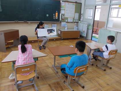 今日は4年生の先生が読み聞かせに来てくださいました。読んでくれた本は「おばけパーティ」という大型絵本で、今まであまり接することのなかった先生に最初は緊張していましたが、かわいいおばけたちにわかばのみんなも見入っていました。