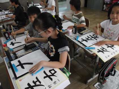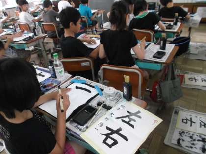 毛筆の授業です。 「はらいの向き」や「筆づかい」に注意しながら学習をすすめました。