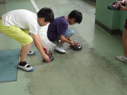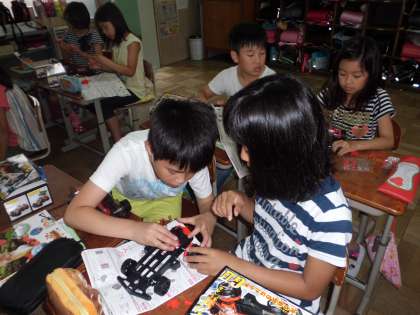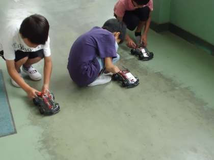 「電池のはたらき」の学習の最後に,モーターカーを組み立てて走らせました。